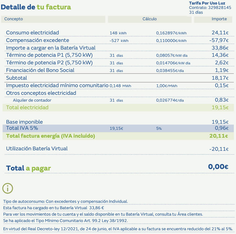 En el caso de que, después de alcanzar un total de factura de 0€, aún quede un remanente, este excedente se acumula en la batería virtual. Este saldo acumulado puede ser utilizado en facturas subsiguientes o en otro punto de suministro perteneciente al mismo titular.